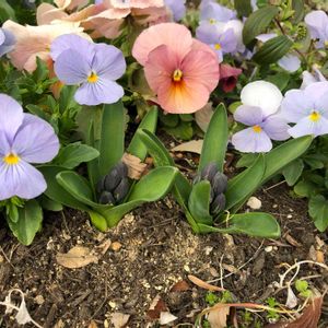 落ち葉片付けてなくて、すいません💦種から育てたビオラの横に、ヒヤシンスの芽が出始めました。春らしくなって楽しみ。