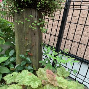 🏷𓈒𓏸︎︎︎︎8日は葉っぱの発表会 ①ワイヤープランツ ヒューケラ 25年前に置いた枕木に ワイヤープランツが アフロになります꒰ ¨̮ ꒱👍 ②ギボウシ ③パンダ🐼すみれの 丸い葉っぱがいっぱい