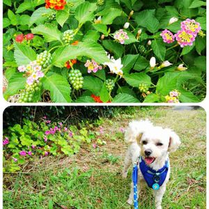 ラッキー&野良猫スーちゃん 仲良く煮干しのオヤツタイム🎶 ツユクサ ランタナ