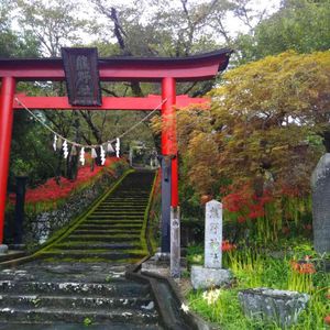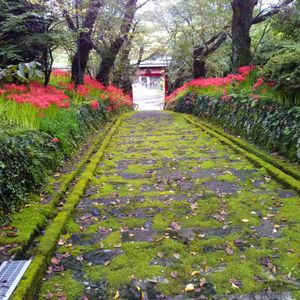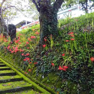 参道は苔蒸した階段が続き… 脇には彼岸花が…
