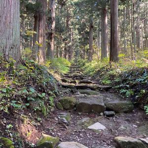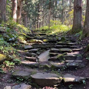 北信地域の 修験神社参道。 山の上の方です。 木の右側は崖です。