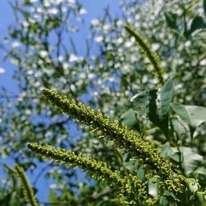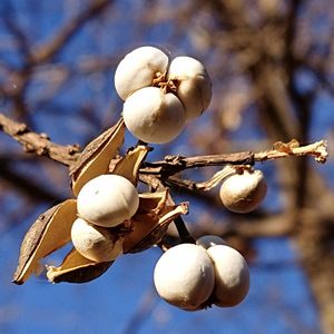 南京櫨(ナンキンハゼ) トウダイグサ科ナンキンハゼ属の落葉高木。中国原産。ロウの原料として江戸時代に導入され、西日本〜琉球で栽培された。スペード型の葉は秋に紫、赤、オレンジ、黄色が入り交じり華やかに紅葉するため公園樹や街路樹として植えられる。花期は6〜7月。枝先に黄色の小さな花が穂状に沢山つく。雌花は穂の付け根の1〜3個だけで、ほとんどが雄花。果実は蒴果。三角状偏球形で径1.5㎝。秋に茶褐色に熟して裂開し、3個の白いロウ質に覆われた種子が出る。油脂の一種である白いロウ質は仮種皮(かしゅひ💬種子の外側を被って種皮のように見えるもの。普通の種皮より柔らかく肉質)で鳥のごちそうであるため、鳥はこの種子をよく食べる。本当の種子は白いロウ質の中にあり、黒く球状で有毒。鳥に種子の部分を食べられては困るので毒を含み、白いロウ質だけが消化され、種子は排泄し散布され、時に河原や林縁に野生化する。 昔は櫨木(ハゼノキ)と共にロウ質をロウソクの原料として利用した。また、中国木蝋は、秋に果実を採取し種子のみを集めて、適当な温度を加えて圧縮すると蝋様物質が採れる。これを中国木蝋という。ススキ類の茎を軸にしてこれに燈心を巻き、この表面に蝋を塗り重ねてあとでススキの軸を抜き去って造る。中国独特のローソクで油煙が出ない。 昔は中国などからの渡来物に『南京』をつけて呼ぶことがあり、ウルシ科の櫨木(ハゼノキ)と同じような性質で美しく紅葉して種子からロウが採れたので『渡来物のハゼ』の意味でこの名がついた。 出典『里山の花木 ハンドブック』『秋の樹木図鑑』『都会の木の花図鑑』『薬草の呟き』