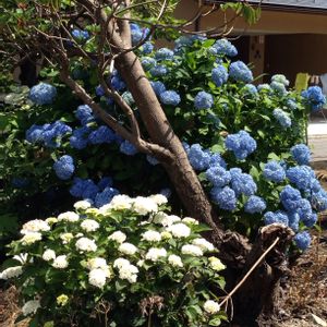 会社の帰り道に白と水色のアジサイが初夏の陽光を受けて輝いてました。