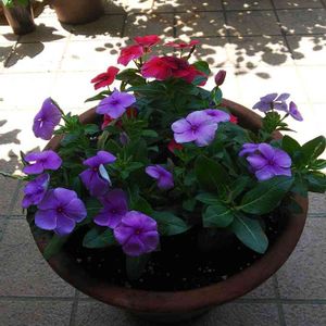 日々草植えました(*^^*) 落ち着いたパープル💜と落ち着いたレッド❣️なのですが、陽があたると違う色に撮れてしまうので、影で撮りました📸 余計に分かりづらいかな❔😅