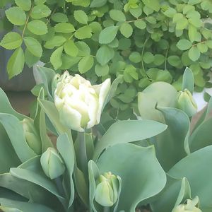 朝は曇りで今は雨☔️ 二年目のチューリップさん🌷ちゃんと咲いてくれそう🥰 ミニバラのチャリオットさんはモサモサです😍