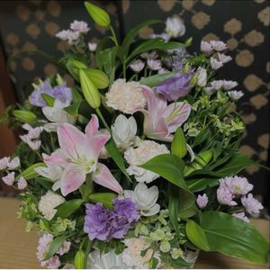 主人が働く職場のフロアのアレンジ花です。毎月花屋さんがきていけてくれます。