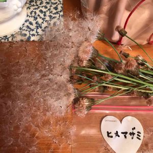 おはようございます☔️ この間ご紹介した✨ヒメアザミ✨ 花を集めて 花瓶にいれて外に置いていましたが キュッと固まったままなので 乾かした方が いいのかなと 水から出しました。 そのままにして寝てしまったら 朝玄関で 綿毛になっていました、散らばる前に見つけて よかったです。 種がたくさん採れました😊 種まきの好きな友達にあげよう🪴