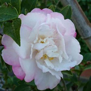 《サザンカ・秋月》 12月上旬頃から咲いている、“秋月”と言うサザンカです✨ ツボミは桃色(紅紫色)で、花弁の内側は白く、開いていくと外側の桃色が覆輪状に残ります。内側から次々と展開してくる花弁は、表裏ともに白いです。開き切るまでは外花弁にのみほのかに桃色(紅紫色)が残り、ふわっと優しい雰囲気に包まれます。 開ききった花はほぼ白色で、清楚で形が整った大輪花となります😊🍀