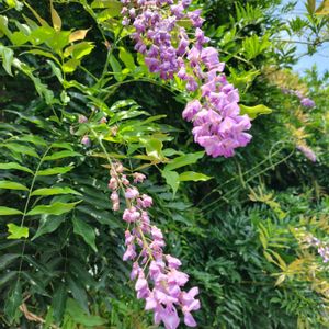 フジ マメ科フジ属 つる性落葉木本 強い日当たりを好むため、日本では公園や庭園などの日光をさえぎるものがない場所に藤棚と呼ばれるものを設置している。 多くの栽培品種がある。 花はふつう薄い紫色で、藤色の色名はこれに由来する。 花期4〜6月 果期10〜12月 花言葉は「至福のとき」「恋に酔う」 このpicは7/8撮影です。2回目の開花が見られ、春に咲いた花の果実もしっかりできていました(⑤)。