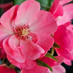 バラとカルミア🌹🌼🌿 ⬅️ アンジェラ 小輪ですが、房咲きで多花性。 微香があります✨ ➡️ カルミア 中々大きくなりません💦 昨年は咲きませんでしたが、今年は可愛らしい花を見せてくれました💕 こんなに濃いピンク色だったかと!