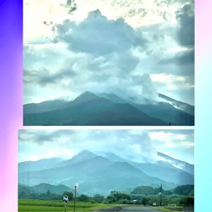 昨日、旦那を飲み会へ送る時🚙💨の空。🗻オッ桜島😳と思いきや、雲がいっぱい集まった田舎の風景でしたー。^_^😜 桜島みたいやねー😅💦でした。