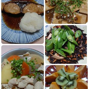 【今日の晩御飯】 天皇陛下の長女【愛子様】が 成人になられました✌️ 中村吉右衛門さんが無くなっていました😭 オミクロン株が国内で2例目が見つかりました‼️ 色々とあった1日ね😅 さてと御飯出来ました‼️ 左上 【鰤の照り焼き】 鰤🐟、醤油、酒、蜂蜜など 大根おろし 左下 【モツの煮込み】 『あさつき』 豚もつ🐷、蒟蒻、大根、人参🥕 ジャガイモ🥔、玉葱 ニンニク、生姜、酒、味噌など 右上 【厚揚げとナメコの煮物】 『あさつき』 厚揚げ、ナメコ🍄 調味料、片栗粉 右真ん中 【ヒジキの煮物】 『平いんげん』 ひじき、人参🥕、椎茸🍄 鳥むね肉🐔、調味料 右下 【果物】 柿、キウイ🥝 その他 納豆 キムチ、チーズ🧀など こんな御飯ですが 宜しければ どうぞ召し上がれ😆👍➰