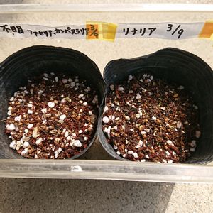 ワイルドフラワー(ハイドロカラーミックス)の中から、分類して、ポットにまいた種が発芽しました。おそらく、リナリアかな?と予想している極小の種からは、とっても小さい芽がたくさん出ていました。種が大粒の方が発芽率が良いと思っていましたが、リナリアが一番芽を出していて、びっくりしています。