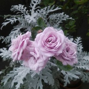 おはようございます😊 今日は曇りのち雨 昨日地震に見舞われた方お見舞い申し上げます。 岡山は震度3でしたが、マンション8階の為結構横揺れが激しく感じ、🐈ネコのユッキーが飛んで逃げたくらいで全く被害はありませんでした。 🌹ミニバラ・モーニングブルーオプティマが花の重みでシルバーリーフの中に垂れ下がり花束のようになっていました✨