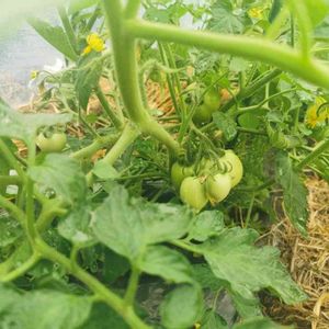中玉トマト凛々子は、 支柱も芽かきも要らないという まさに家庭菜園初心者の私のピッタリ💕 と思って苗を2つ植えましたが・・・😃 支柱がないと支えられないほどタワワに実が成り始めていますぅ🤩 一応、始めに支柱は立てましたが、広がった枝から実が垂れて地面に付いていたので、さらに支柱追加!! いやー嬉しい🎵😍🎵
