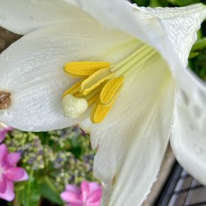 こんにちは テッポウユリが咲きました 雨で花弁が傷んでしまいました💦 🏷️白い水曜日♡ 2.3枚目は庭の赤い紫陽花です 今が一番可愛い💕