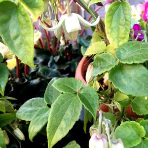 冬咲クレマチス 昨年末JA旬菜蔵で見つけた子です。 我が家にお迎えしました😊 蕾が沢山付いていてラベルには 手書きで生産者名と冬咲クレマチスと 書いてありイメージ写真はなく どんな色の子が咲くのかワクワクして買いました。 やっと咲き始めました〜。🧚♂️ ホワイトベル🔔🧚♀️ という感じのイメージです。 🧚♀️我が家のテラスへようこそ〜🧚♂️ M Iさんに教えていただきました。 冬咲クレマチス アンスンエンシス です。