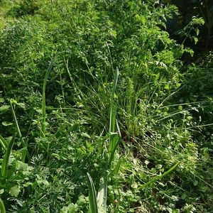 ニンニクの芽が出て来ましたが草がすごすぎて自然栽培みたいになってます(笑)人参も間引きしてません(笑)山の上に住んでるので遠くの下界が望めます(*^^*)