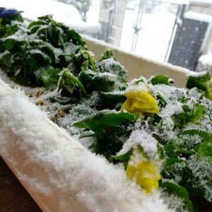 おはようございます😊 軒下のパンジーにまた雪が積もりました❄️ 簡易温室はもう満員御礼で このパンジーとミニバラとチューリップは 軒下で堪え忍んでいます💦 外は更に10cmほど積もり、 今もどさどさ降り続いています☃️ 家の周りや庭の雪の山が まだ40~50cm残ってるのに😓 もうホントに雪はいらないです😩 今日も1日元気に過ごせますように🌹