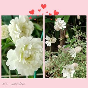 今年も元気に咲きました💓 お気に入りのホワイトのシレネさん達✨ ◀スワンレイク 八重咲きでカーネーションの様な可愛いお花✨ まるで白鳥の湖のバレエのチュチュみたいで可憐です🎵 ▶ユニフローラ バリエガータ 斑入りのリーフにぷっくりんこの壺型のお花がとってもキュートな子😚