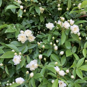 ①風の中で揺れながら逆光の 🌹アイスバーグ🌹 日に透けてまるで天使の様だ 清楚な佇まいに香りまである 魅惑のバラの花 ちょっと褒めすぎかな😄 ②蕾の可愛さを ③後ろ姿の粋な感じを 沢山のお花と共に ④星型のお花チョウジソウ ⑤斑入りの葉が美しい ナルコユリです