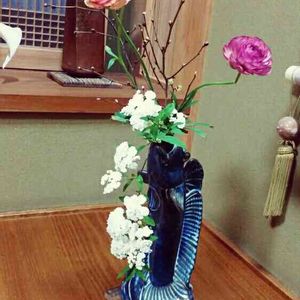 ラナンキュラスが次々と咲いてきました。 カラフルに色付いています。 コデマリも八重のもので、とても綺麗です。 大好きなお花を、大切に使っているムツゴロウの花器へ、、