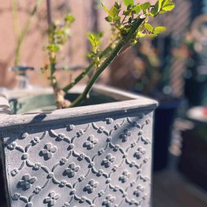 恋きららも芽が伸びてきました🌿🌹 空いていたローラアシュレイの鉢になんとなく入れてみたら、スリット鉢のサイズが見事にピッタリで今度は抜けなくなってしまいました😂 隙間に指が入らず怪我しそうなのであきらめて鉢増しまでこのまま育てようと思います😅