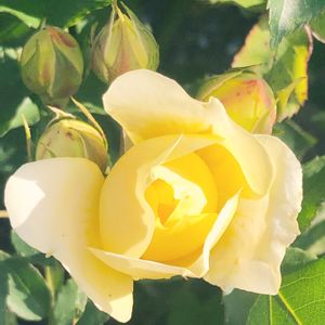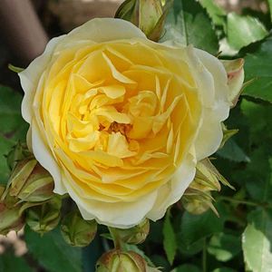 黄色で咲き始め開花共に淡い黄色となり房でグラデーションとなる。 ティー香の香りがあり比較的花もちもよい。 樹形を乱すような枝があまり出ないので鉢栽培にも向く。 半直立性で、葉色はやや淡く、枝にトゲは少ない。 小型品種なので冬季剪定では強く切り戻さずに樹高の2/3位を残すようにする。 フロリバンダ 黄色 バラ 木立ち性 四季咲き