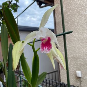 🍀カトレア マキシマ🍀 苗を買ってから4年経ち、やっと咲きました😆‼︎ まだ開ききってないけど投稿しちゃいます😅 昨年夏、ふたつのバルブにシースが出て ひとつがいま❣️ もうひとつはダメでした 更に秋にふたつのバルブが完成しシースが出てます❗️ Cattleya maxima