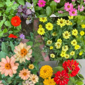 今朝の雨上がり後のジニア大集合❁✿✾ ジニアは花もちがすごく良く、咲き始めと先終わりの花色が違うのも楽しめる🥰あともう少し頑張って( ˶˙º˙˶ )୨ 右1番下の寄せ植えにした赤と黄色のジニアはうどん粉病になってる(>︿<。)
