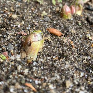 福寿草の芽です(^_^)v 何処か分かるでしょうか? 未だ固い蕾ですよ~ 蕾の先、齧らないで欲しいな。(^。^;)