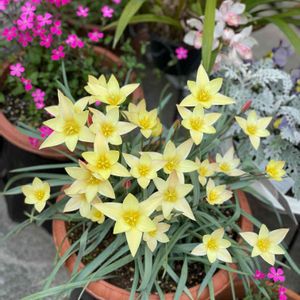 答えは原種チューリップ🌷🌷🌷 めっちゃ可愛いです🥰 去年アチコチ向いてたので、今年は教えてもらった花束植えにしてみたら、だいたい真ん中に揃って咲いてくれました💕 皆さま、今日も良い一日を〜🍀