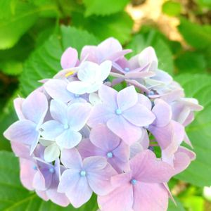 ♪あじさい・スフレ♪ 今年は3本花がつきました🩵💜 昨年コガネムシの幼虫(15匹程)に 根っこをすべて食べられ 瀕死だったスフレさん もうサヨウナラ…だと思ってました が、何と復活して4本新しい枝を伸ばし そのうちの3本にお花が! 奇跡です🥹 でもスフレの特徴の美しい斑が全くなくなり普通のあじさいの葉っぱに… 色も紫からブルー寄りに ①お花中央のアップ ②お花全体と緑の葉っぱ ③2022年の斑が美しかった時のお花