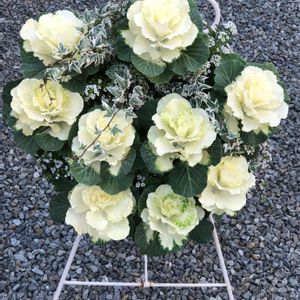 白葉牡丹 の 花苗リース 一昨日のご近所さんとのお出かけで、可愛いガーデンシクラメンだけじゃなく、この植え込み済み花苗リースも見つけちゃいました。 実はつい最近、ネットで花苗リース用の枠台座と土のセットなどを見て、 ちょっとやってみたいなと思ってたんです。 でもここら辺は私が小娘扱いされちゃうようなご年配もいらっしゃるから、お悔やみ花とか、開店祝い向けのスタンド花みたいに思われないかな〜。って迷ってしまって、最終的に一式揃えたら私的にとてもお高い金額になると判明したので、諦めたばかりでした。 こちらは、スタンド込みで考えるとネットで見たより四割くらいお安いお値段で、ご年配ってほどのお歳ではないけど私よりは年上のご近所さんが 「あぁ、やってみたいって言ってたのこれだったの? こんなの見たことなかったけど、ウエルカムボードみたいで可愛いじゃない!」 と言ってくださったので、お迎えしちゃいました! 家周辺のご年配の方々がどんな反応なさるか、ドキドキです。 (f^^)