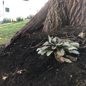 木の根元にアジュガ バーガンディグローを植えました。耐寒性多年草。なのに表記には最低温度0度って書いてある😅