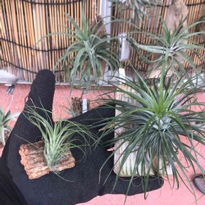 100均エアープランツの子株たち(1番左のぞく)が大きくなってきたので、並べてみました。 エアープランツスタンドは木切れ➕ワイヤーで1個3分で自作した物です。 今年も子株が生まれそうなので、エアープランツスタンドもっと並べたい💛