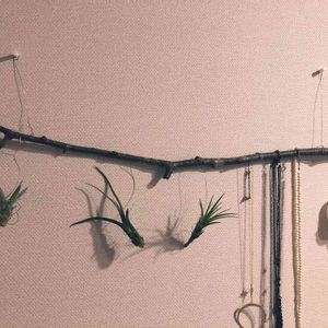 森で拾った枝を使ってハンガーを作り、針金を巻いてエアプランツを飾りました。