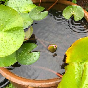 ずっと降り続ける雨☔️もう雨はいつまで💦🥲 小降りの時、睡蓮の蕾👀✨ メダカも下の方へ隠れてます◡̈⃝︎⋆︎* 災害と感染 お互い気をつけましょう🍃🙏