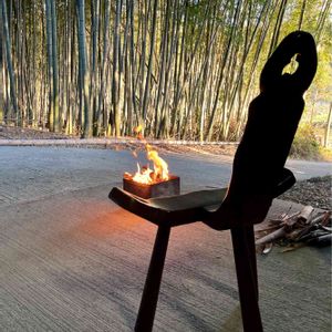 三本脚の素朴な手作りの椅子シェファードチェア(羊飼いの椅子)に腰掛け、お煎餅の缶に枯れた竹をくべてます🔥 そこから離れられなくなり仕事が滞っている次第です💦