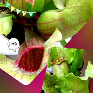 ❦〜不思議な食虫植物〜❦ ↑サラセニア〰模様がくっきり!!💃🙌 ↓粘りつけ式~腺毛の先にでる粘液でヌルヌル😱ぁ、👀虫🫣🤫🫡 🏷毎月2日はスヌーピーの日 🏷コラージュ仲間たち 参加させて頂きま〰す🥳🎶