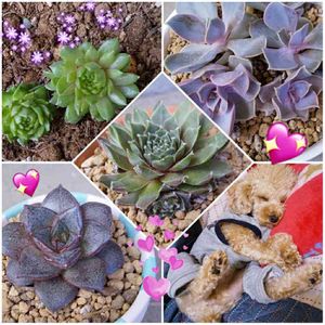 おはようございます☀️ 100均でまたまた当たり🎯の多肉ちゃん💕ゲット👍 上の3個は名前不明⁉️💦 うちの🐩は手術後に付けていたエリザベスガードを取ってもらって💦 変なカッコで爆睡してます🤣