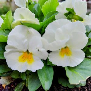 //March 18, 2024// Good Morning! よく咲くスミレ ”ミルクセーキ” 美味しそうに(笑)、並んで咲いています 優しい色合い& ちょうどよい大きさの花びらです😊