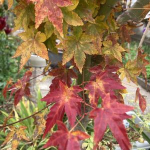 やっと🍁紅葉ましたイロハ紅葉🍁 公園のイロハモミジから落ちた種が芽を出して🌱、家の庭に植えてから無事に育った2本のイロハモミジ🥰 去年は赤くならずに散ってしまったけど、今年は遅ればせながら紅葉🍁しました記念撮影😊 ④⑤3個の赤い百合の球根から花が咲き、まだ散らずに咲いています🥰