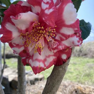 今日の庭の花 太神楽椿 もう、終わりかけなのですが、一枚目の花は白がたくさん入った椿です 我が家の太神楽椿は赤の方が強く出るので、白の多い花を載せました。 今年は、メジロやヒヨドリの餌となりました。雪の中でも、しっかり咲いて強い椿です。