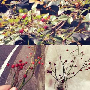 散歩中に、お宝GETしました‼️ 自生している野ばらの実を発見。棘と格闘しながら頑張りました〜自生なので、高い位置にあるんです〜 左下は、帰りしなにパチリ。右下は先日にどんぐりを持ち帰りビンに入れた中に、さしてみました。
