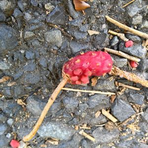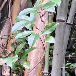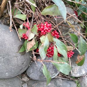 サネカズラ 赤く膨らんだ花床の周りに小さな実がみっしりと付く集合果🔴もちろん子房全てが膨らむわけでもないし、途中で落ちることもあるからきれいな形じゃないこともある‥ でも、食べた跡があっても丸裸にはならないことがあるのはどういうことだろう? メジロサイズだと丸飲みするには大きいのでチョイチョイと啄むのだろうけれど、後で食べに来ないの? 常緑性の葉は赤くなることもあって、これは糖分の濃度を上げて寒さ対策をしているのだろう🟩(3、4枚目) つるは左肩上がりS巻きの つる巻き月曜日🏷(5枚目)