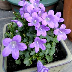 こんばんは😊 きのう一日降り続いた雨のおかげで 外組の鉢植えの花たちは かなりのダメージ😢 …夕方になって花がら摘みを 頑張りました😅 軒下組の🍀カンパニュラ(オトメギキョウ)🍀が 復活!第2弾が咲き出していました🖐️ 小さな苗…小さな鉢植えです😘