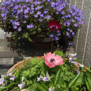 ほったらかしでも毎年咲いてくれるアネモネちゃん💕そして何年目だろ、、ってくらい毎年咲いてくれるブルーの花。名前忘れてしまった、、とても良い子達です(^^)♡