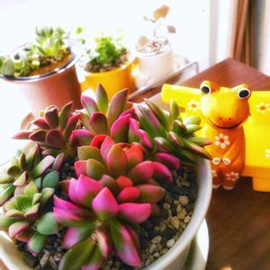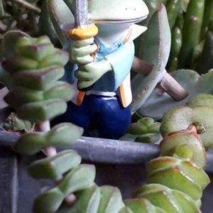 多肉の寄せ植えの中にカエルくんが そんな所で寝たら風邪ひくよ🤧 娘の多肉ちゃん 借りてきたよ。