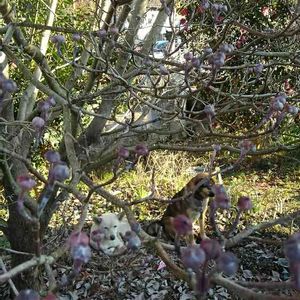 すっかり葉を落とした花水木の落ち葉でまったりしている2匹の野良犬ちゃんです(笑)蕾が春を待ってます🌼🌼
